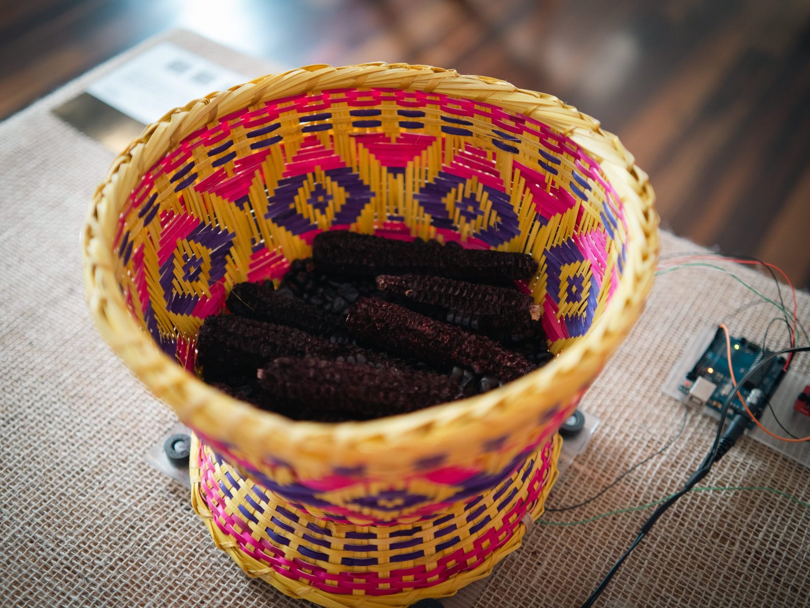 O milho é um alimento fundamental e sagrado na América do Sul, presente na culinária e cultura indígena há milênios, aqui é ofertado e apresentado em um cesto feito pela etnia indígena Kaigang, um povo originário do Sul e Sudeste do Brasil, que utiliza técnicas tradicionais e materiais como palha e fibra de taquara para criar cestas com belos grafismos, vendidas para gerar renda e preservar sua cultura.